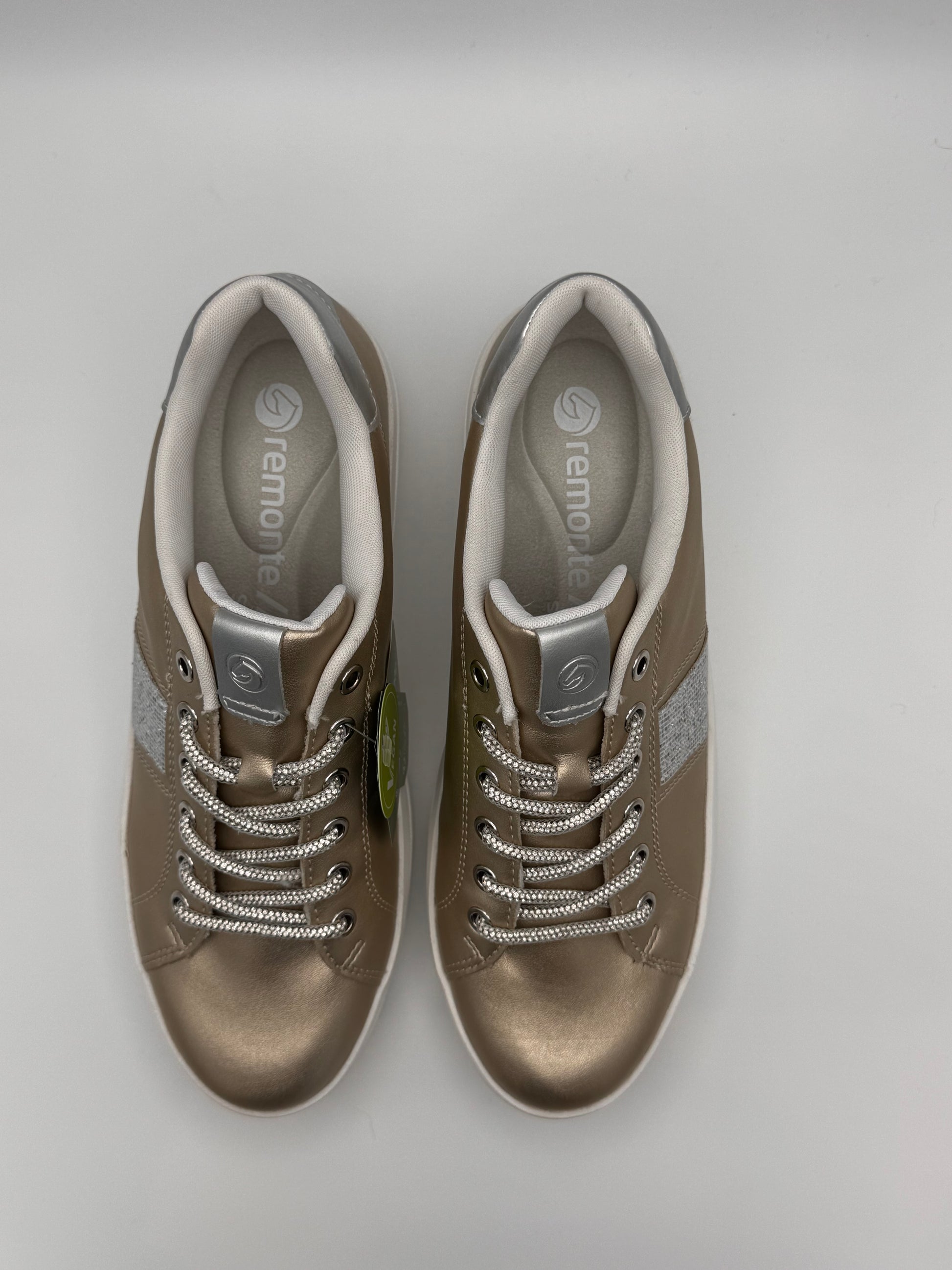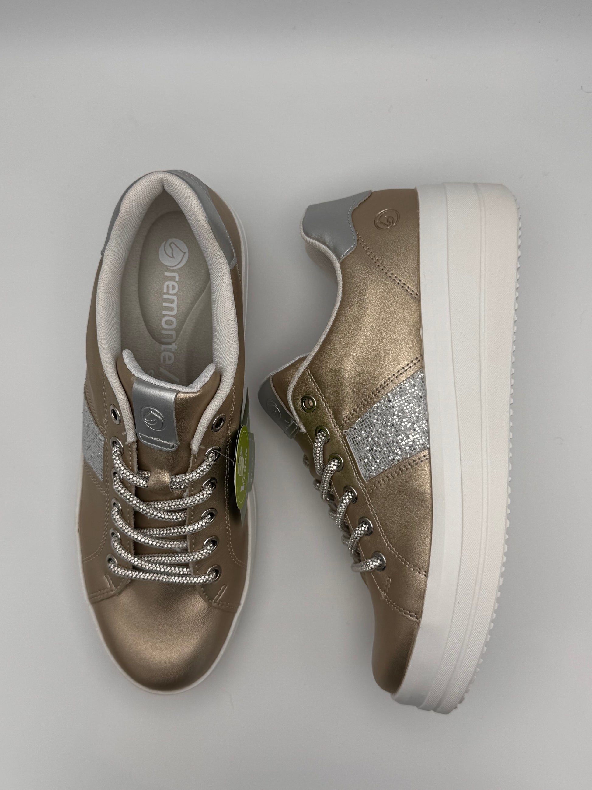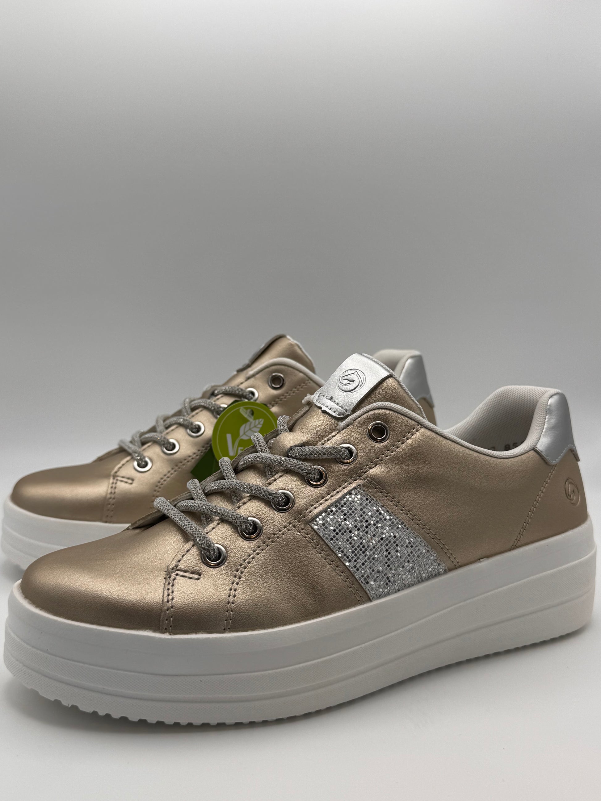 Apportez une touche d’éclat à vos looks du quotidien avec ces sneakers à plateforme au fini métallisé élégant. Leur design moderne est sublimé par un empiècement latéral pailleté et des lacets scintillants qui captent délicatement la lumière.