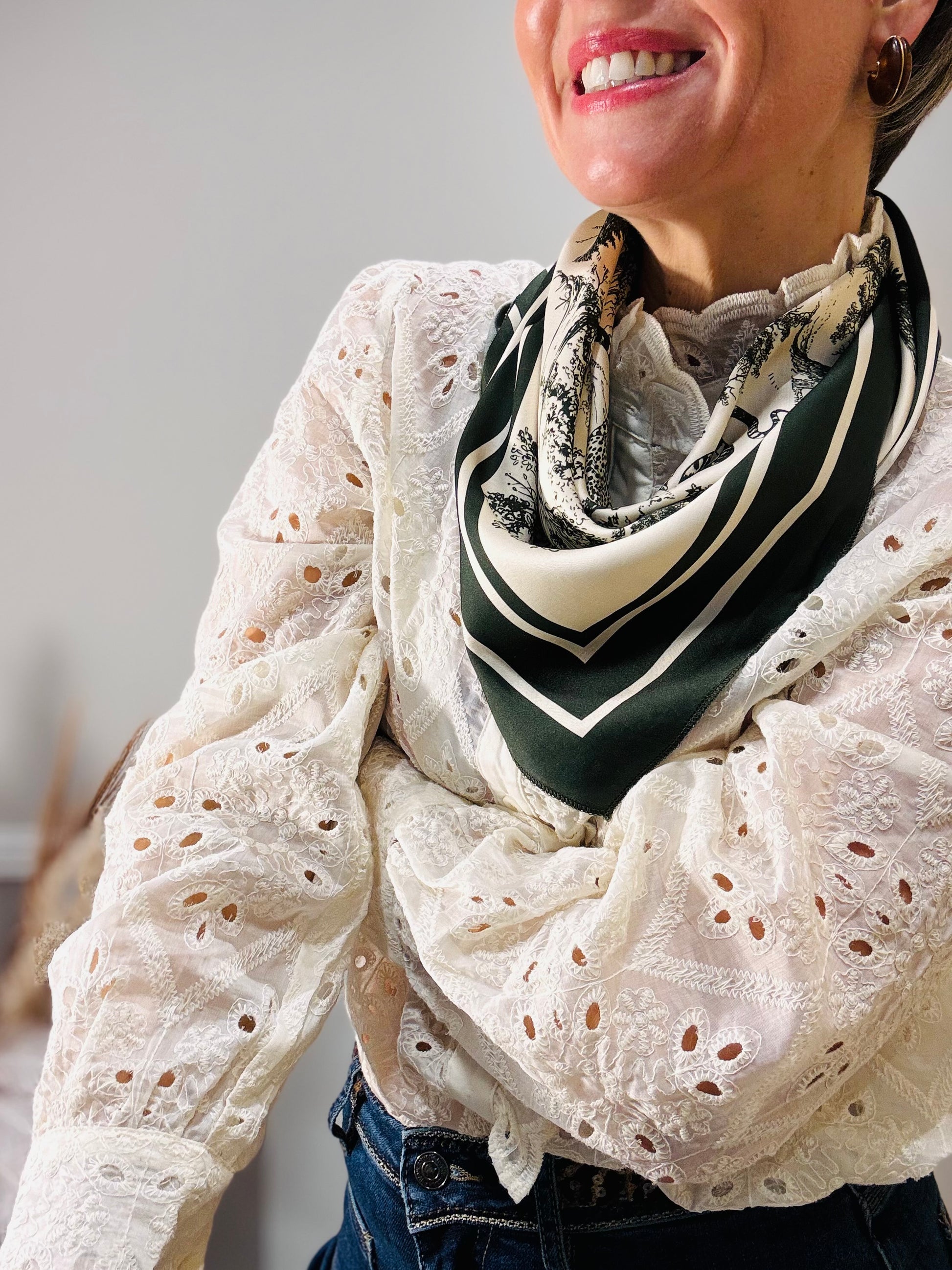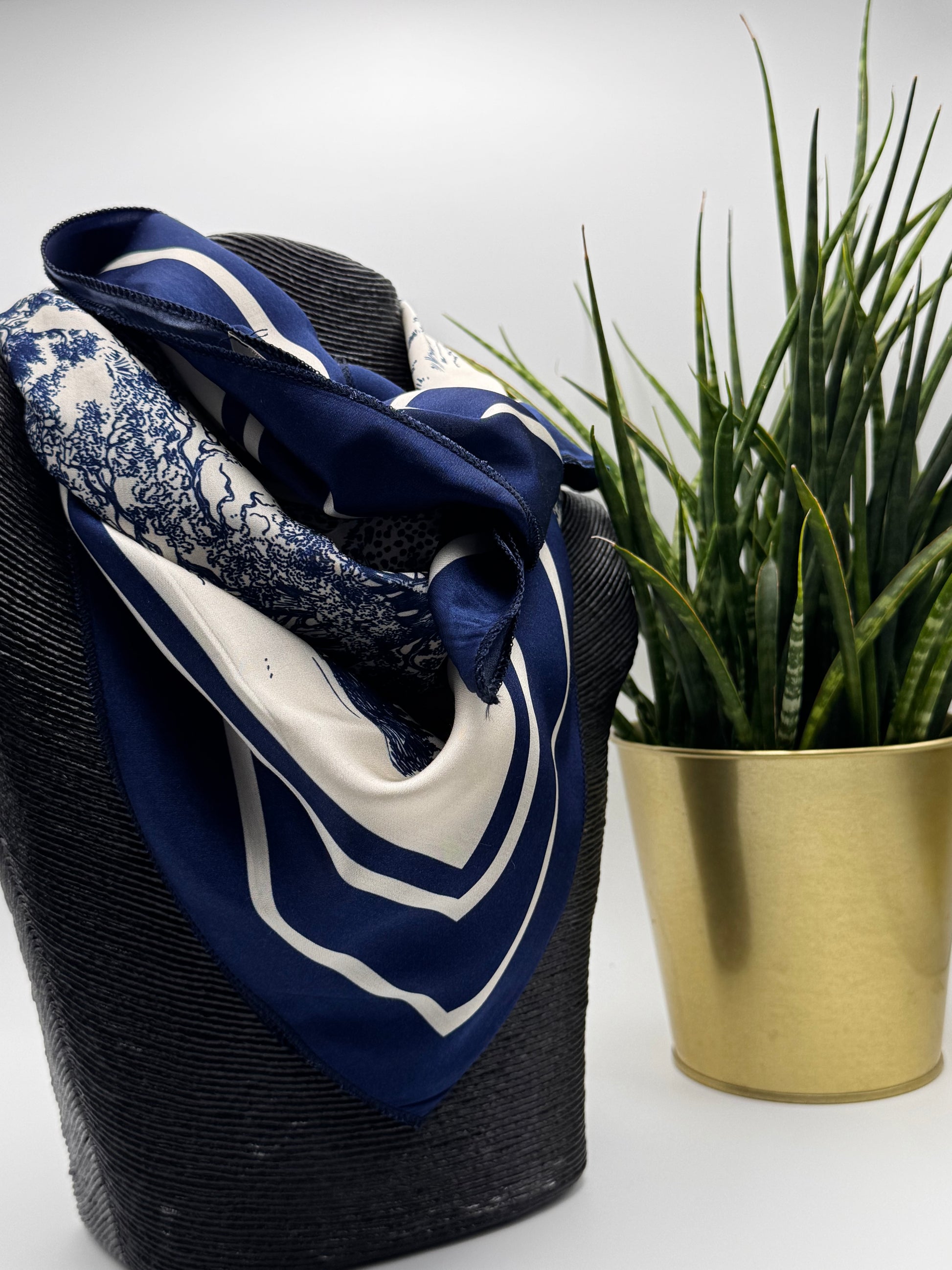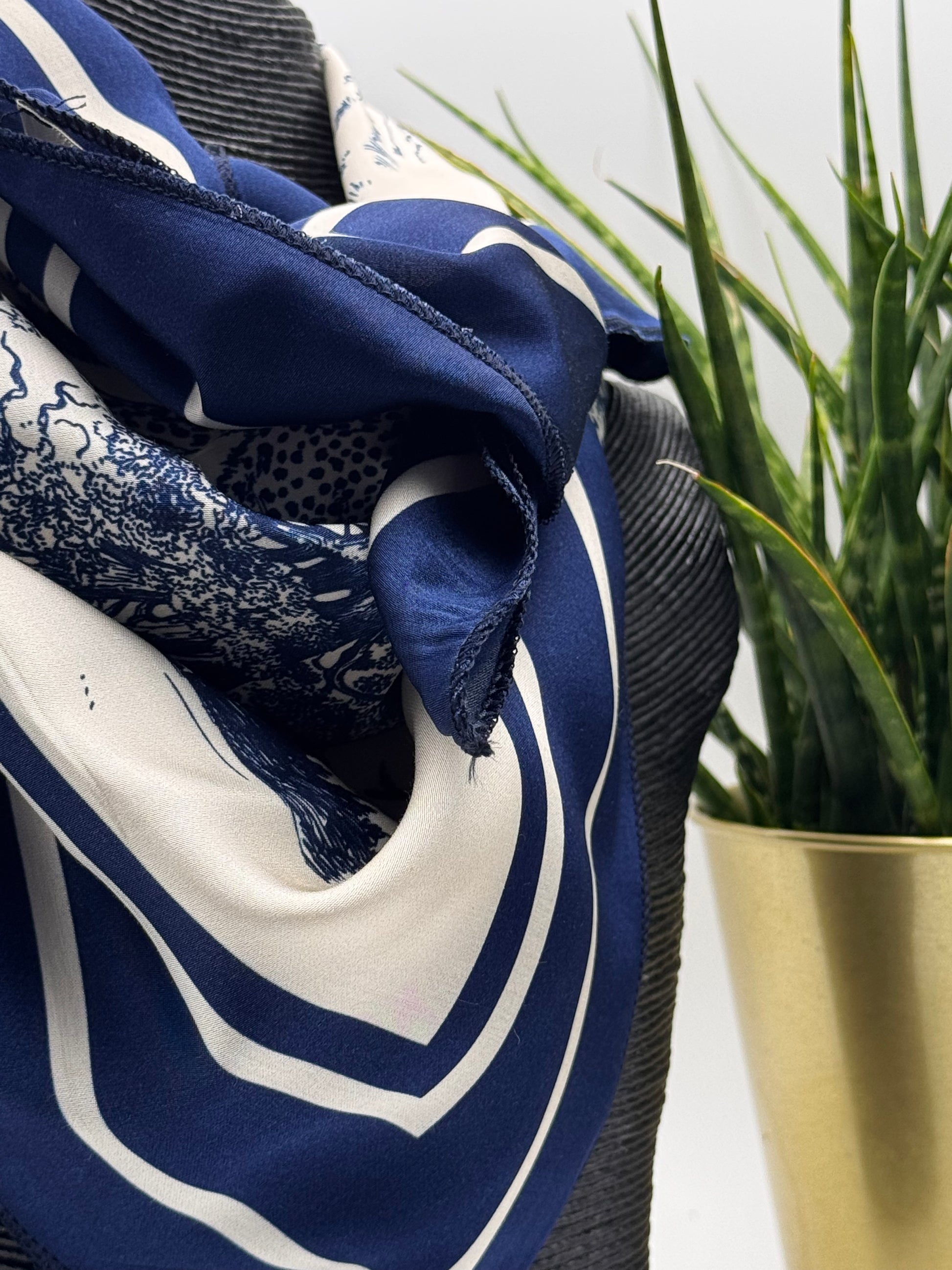 Confectionné dans une matière fluide et soyeuse ( viscose 80% et soie 20%), ce foulard se porte aussi bien autour du cou qu’en accessoire dans les cheveux, à la taille ou sur un sac pour une touche d’élégance naturelle.