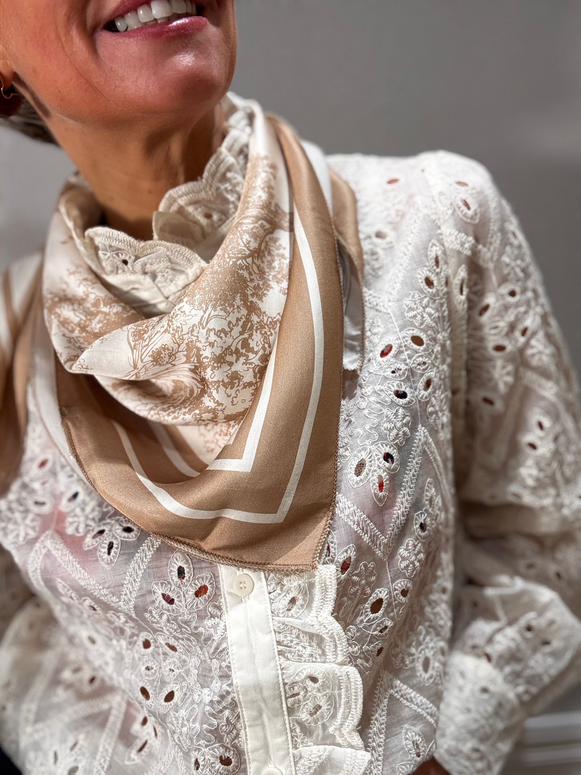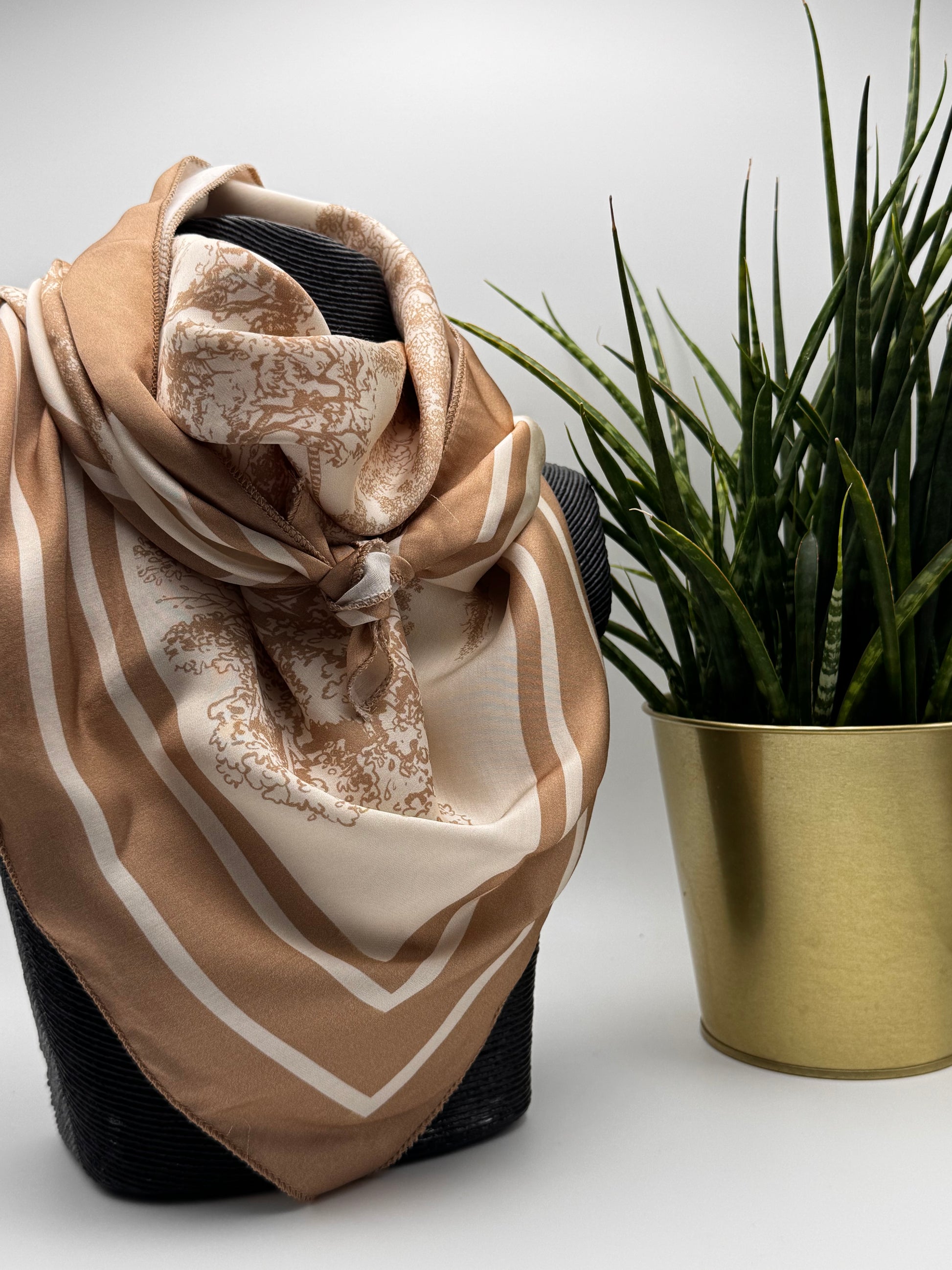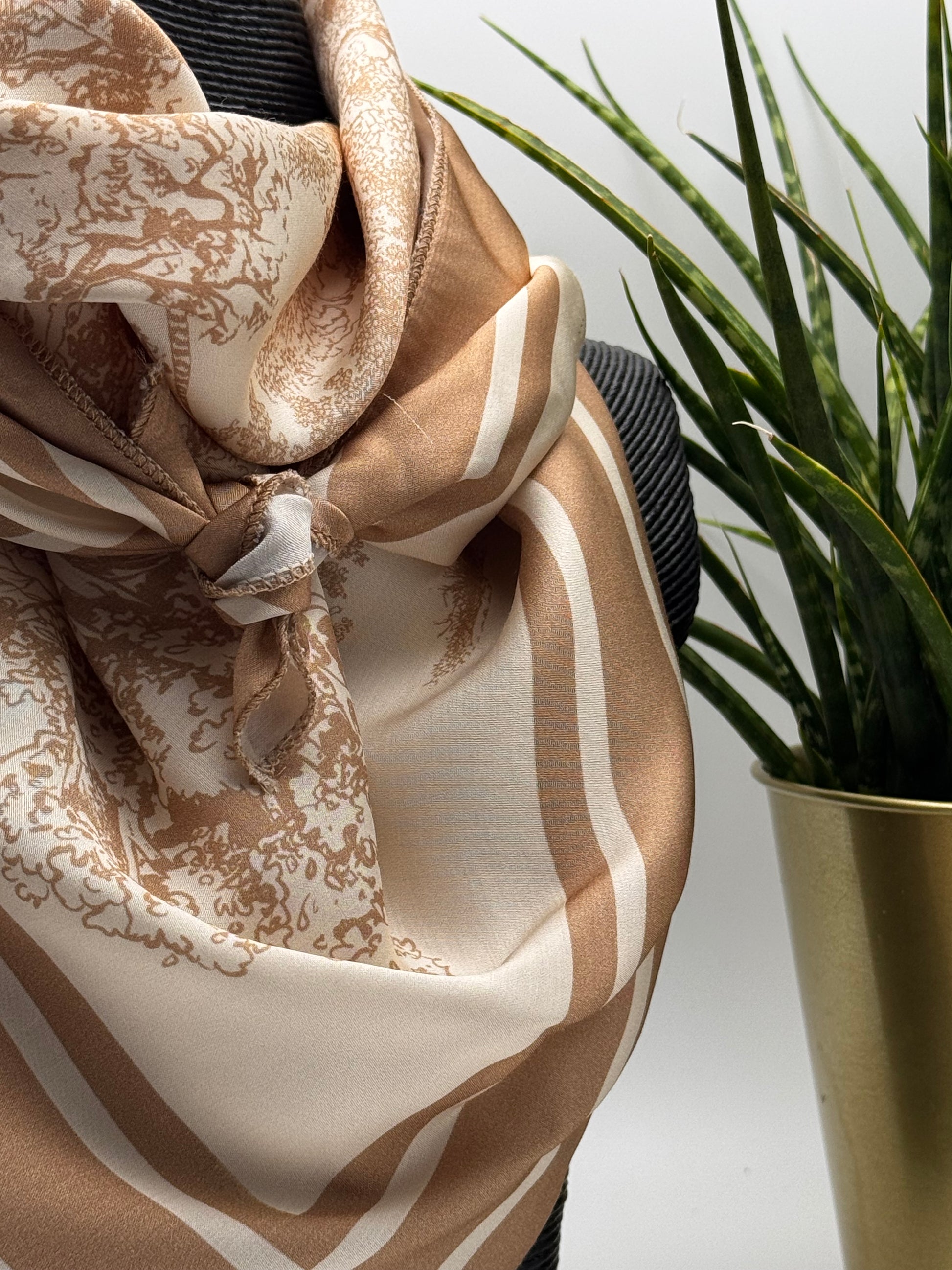 Confectionné dans une matière fluide et soyeuse ( viscose 80% et soie 20%), ce foulard se porte aussi bien autour du cou qu’en accessoire dans les cheveux, à la taille ou sur un sac pour une touche d’élégance naturelle.