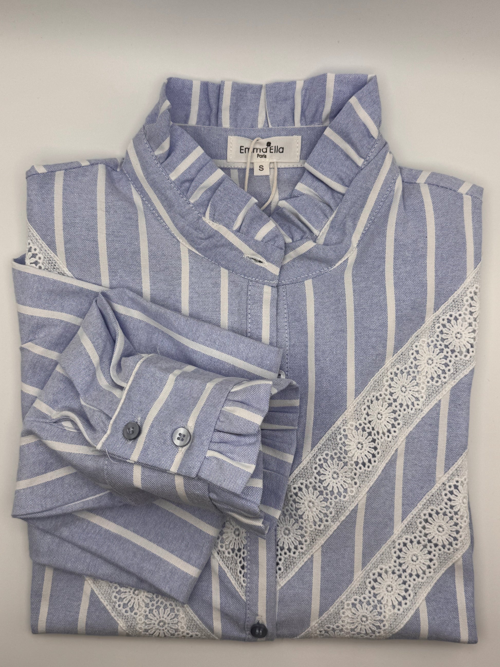 Son motif à fines rayures bleu clair et blanches apporte une touche de fraîcheur et d’élégance intemporelle. Le col volanté ajoute du caractère et une note romantique, tandis que les empiècements de dentelle ajourée sur le devant subliment la silhouette avec raffinement et subtilité.