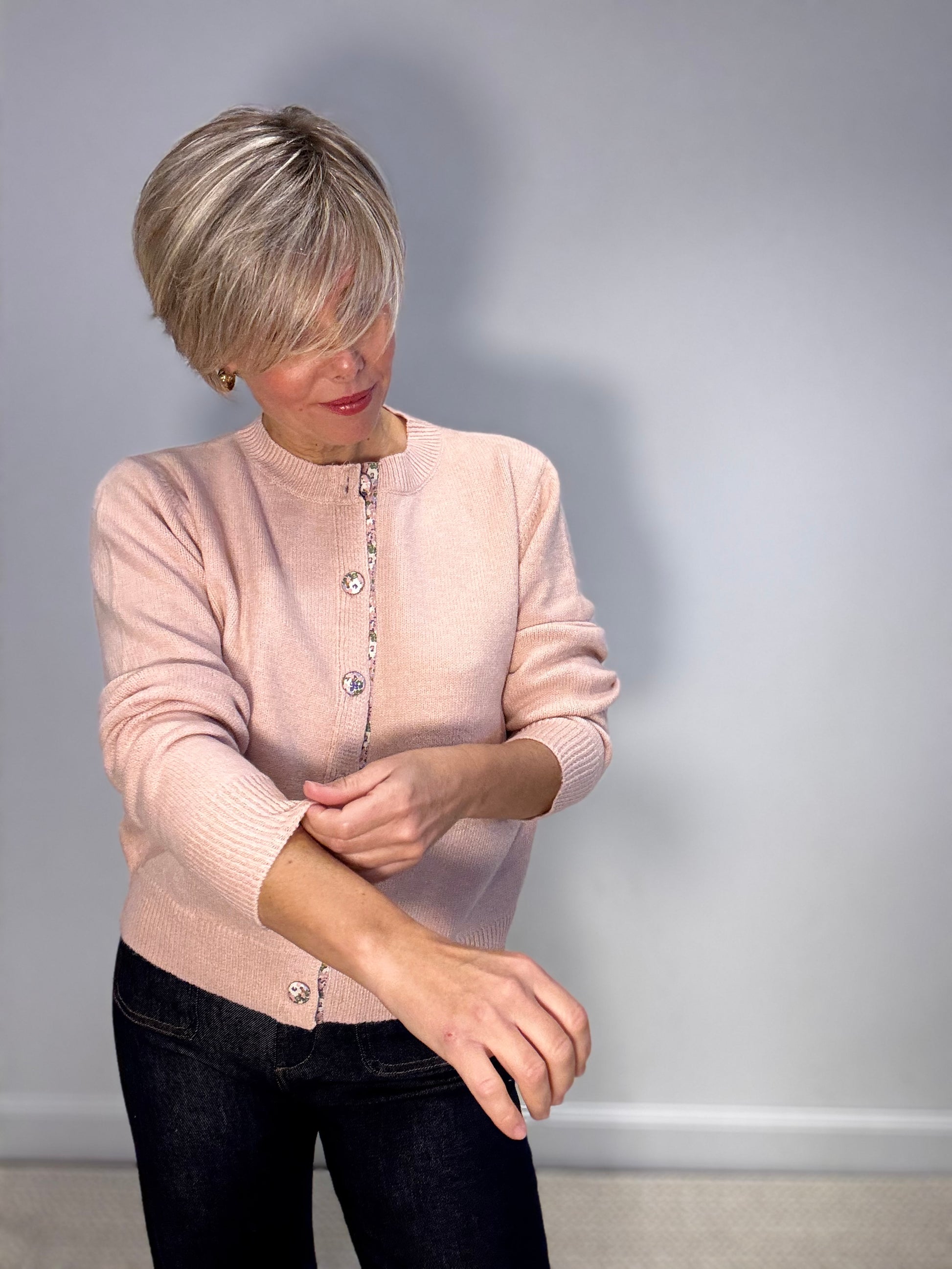 Ce gilet en maille fine couleur chocolat ou rose poudré est la pièce cocooning parfaite pour traverser la saison avec style. Sa coupe droite, légèrement ajustée, sublime la silhouette tout en offrant un confort absolu. Les boutons recouverts d’un tissu fleuri, délicatement assortis, apportent une touche de féminité et de raffinement.