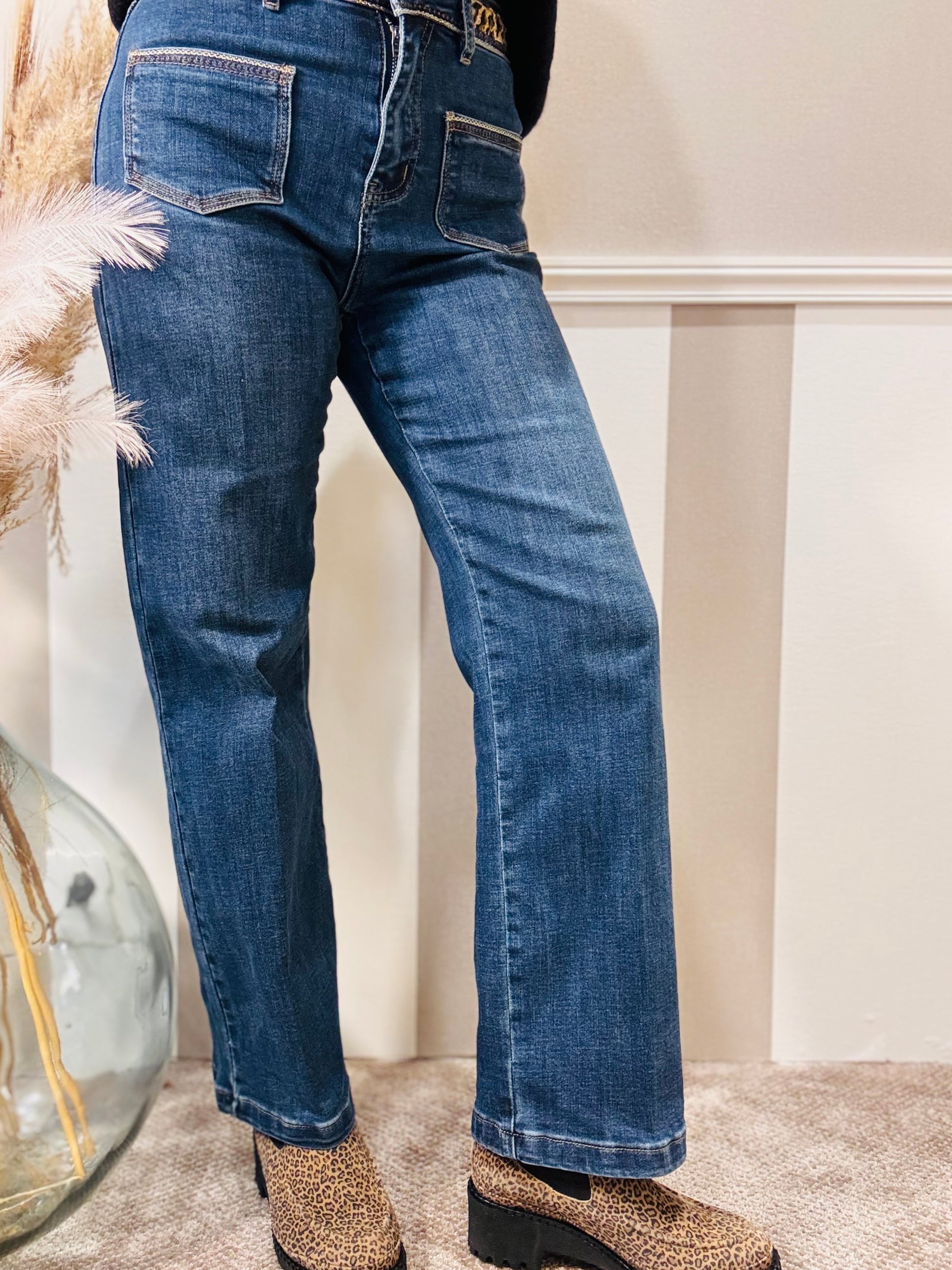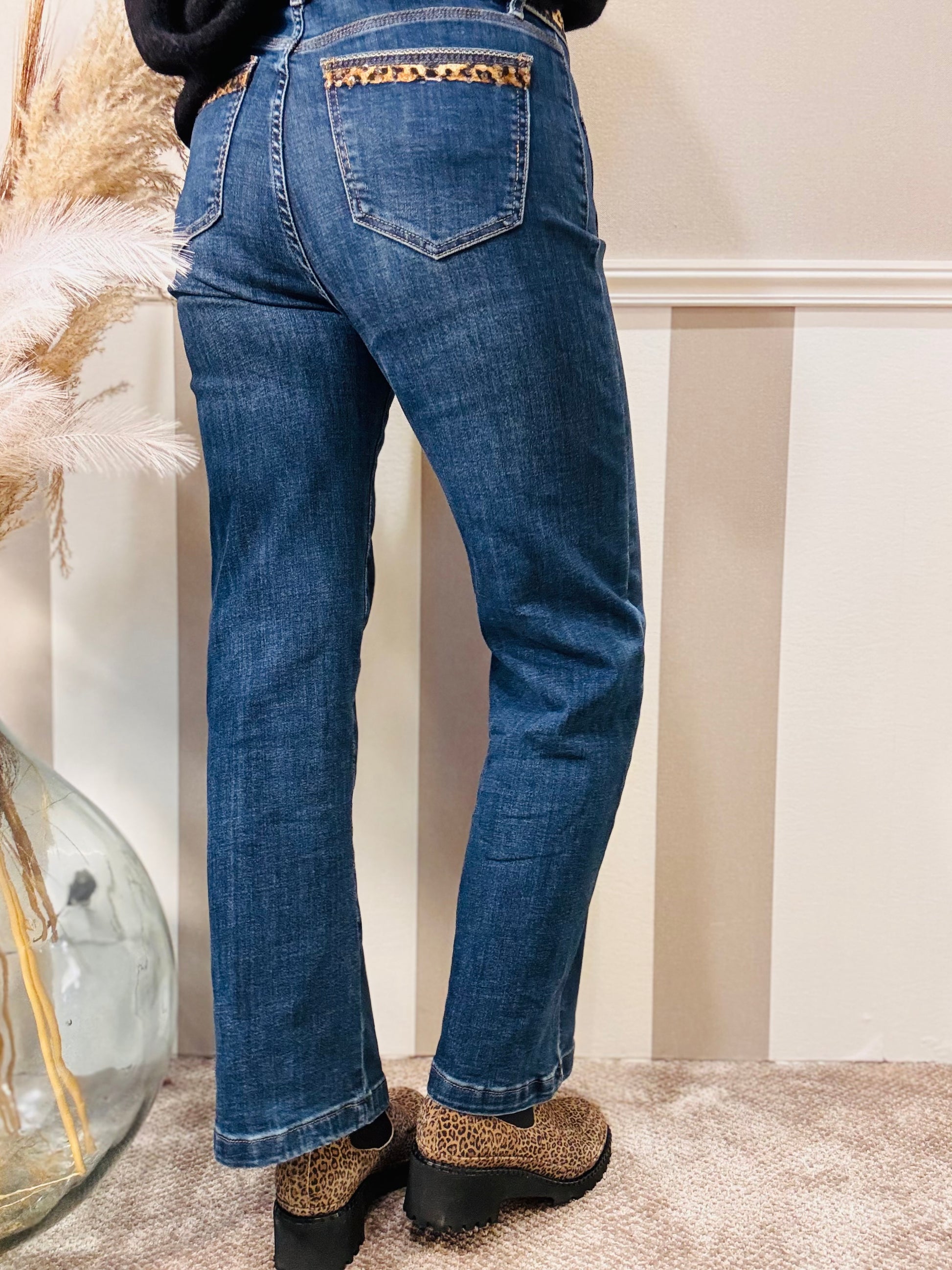 💙 Le Léo, Jean Bleu Taille Haute – Détail Sequins Léopard