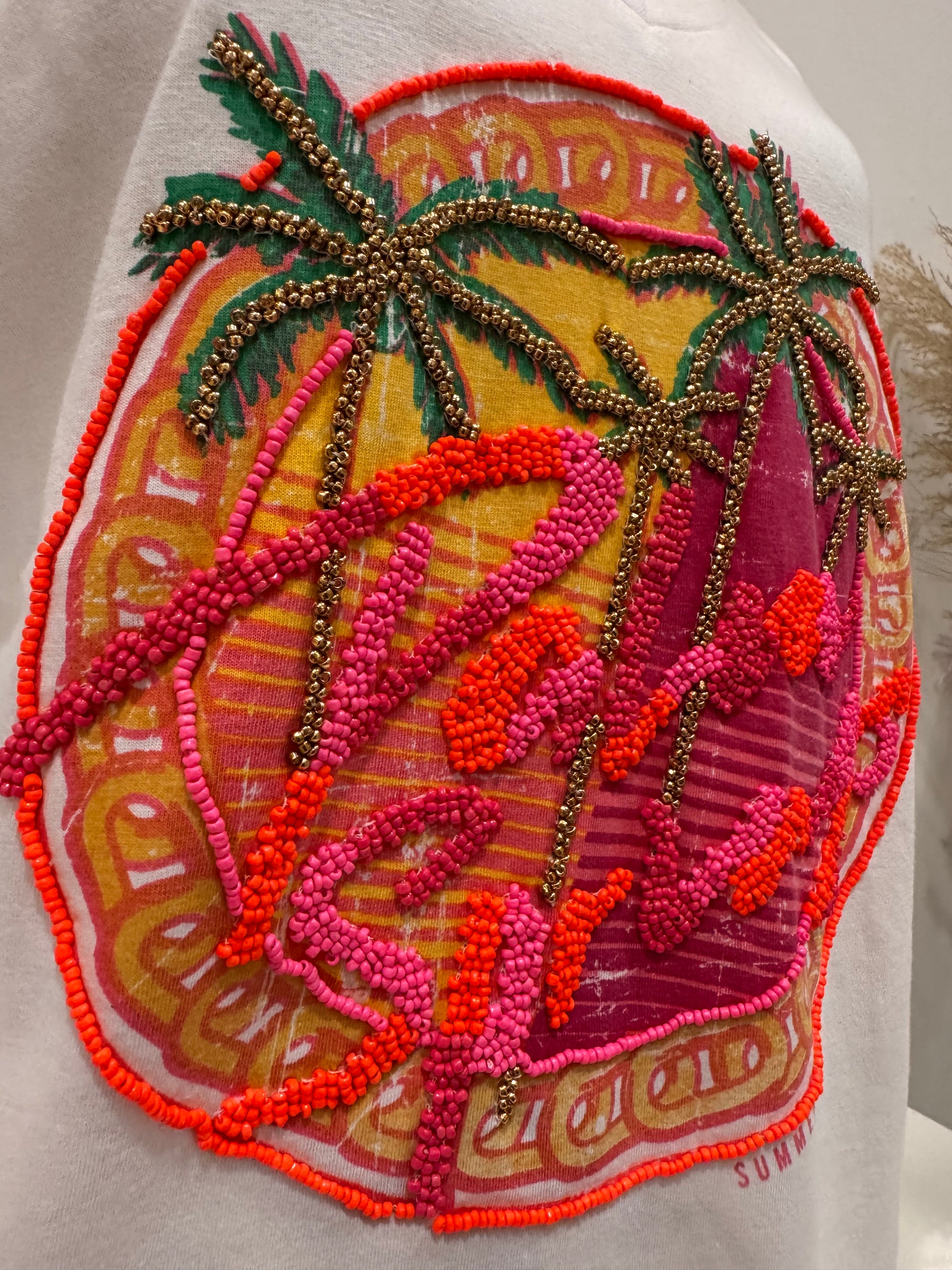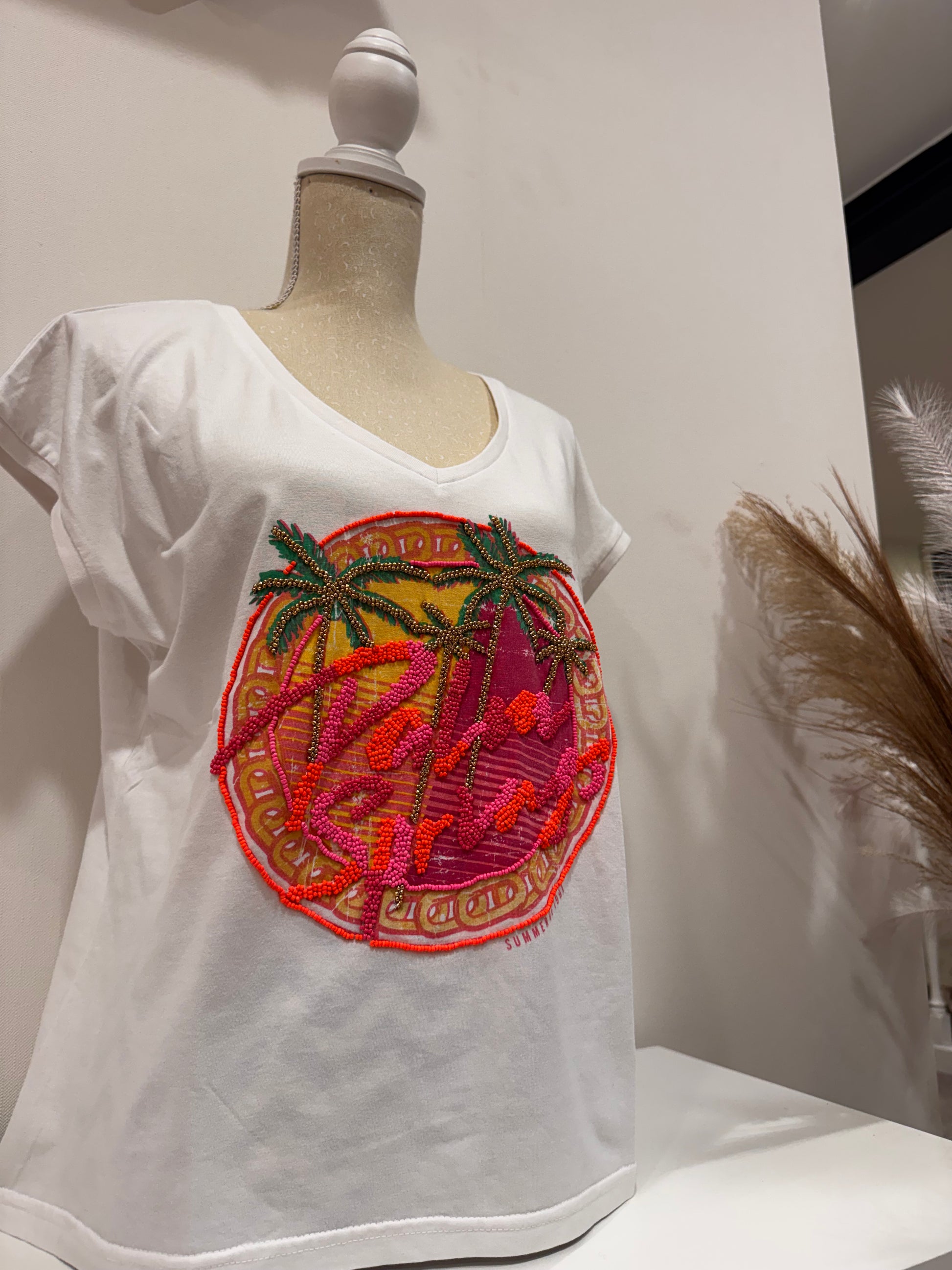 Tee shirt en coton col V avec print agrémenté de perles
